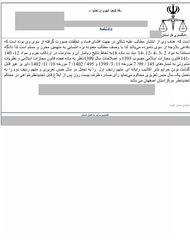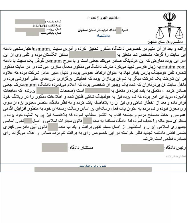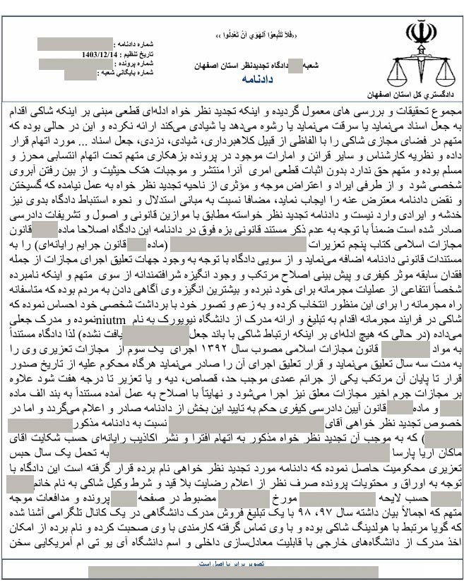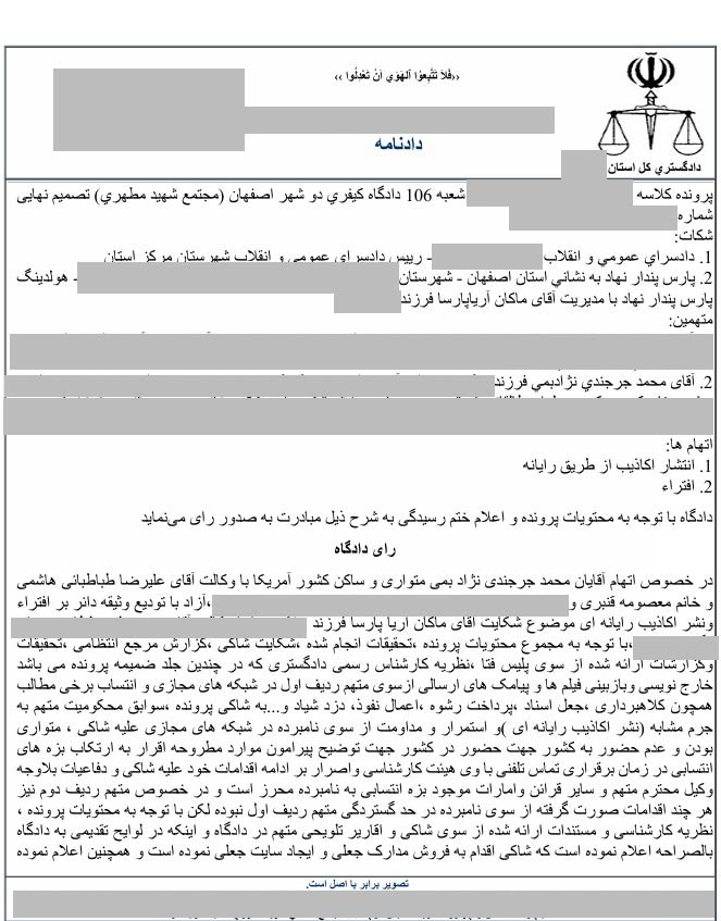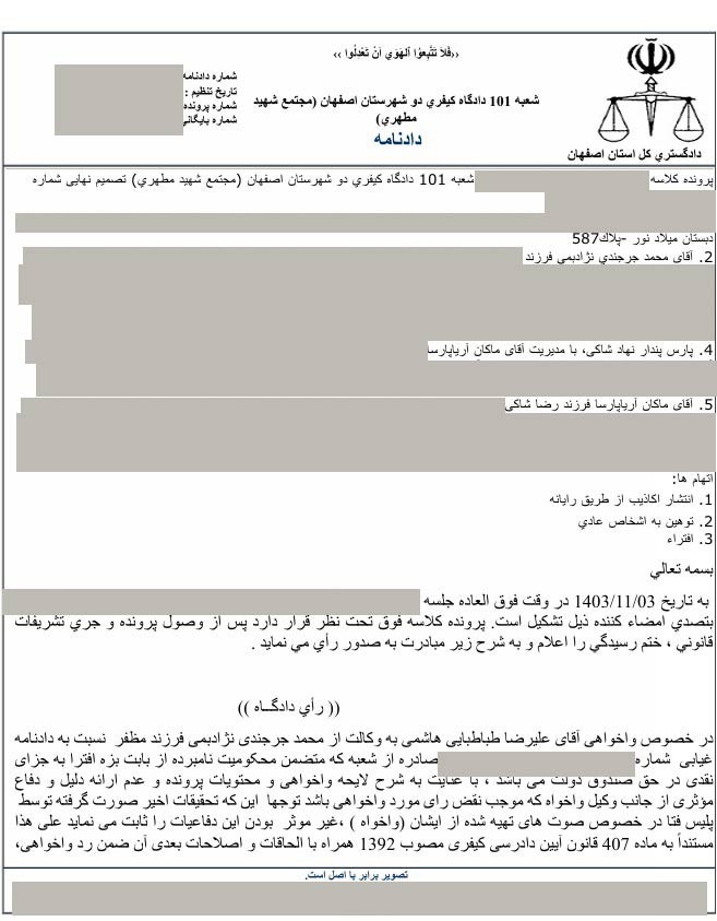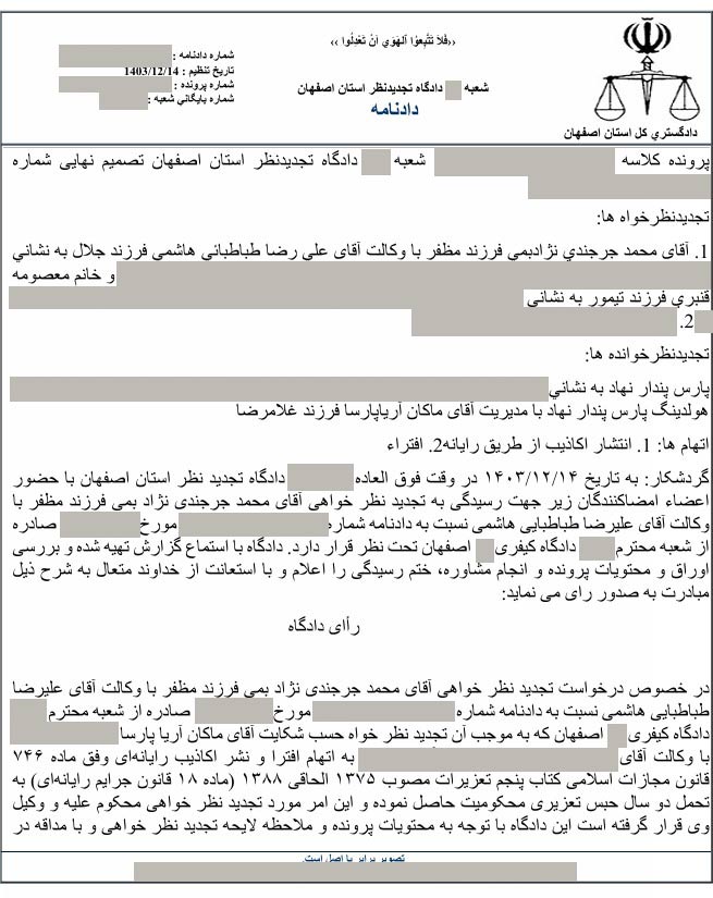 با توجه به درخواست تجدیدنظر آقای محمد جرجندی نسبت به حکم 2 سال حبس وی، جلسه ای در تاریخ 14 اسفند ماه 1403 در دادگاه تجدید نظر استان اصفهان تشکیل شد و با توجه به اینکه وی هیچ ادله قطعی راجع به افتراهای خود نسبت به دکتر آریا پارسا و گروه بین المللی پارس پندار نهاد ارائه نکرد، دادگاه تجدیدنظر، حکم قطعی 2 سال حبس را برای ایشان صادر نمود. همچنین در این دادگاه به اتهامات یکی از ادمین های آقای جرجندی که وی نیز افتراهایی را نسبت به دکتر آریا پارسا در شبکه های اجتماعی مطرح کرده بود، رسیدگی شد. ایشان در دادگاه بدوی به یک سال حبس تعزیری محکوم شده بود ولی با توجه به عذرخواهی وی و رضایت دکتر آریا پارسا، حکم برائت برای ایشان صادر گردید. تصویر حکم صادر شده به شرح زیر است: