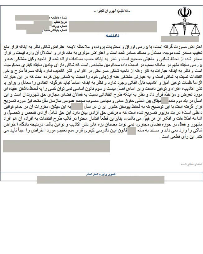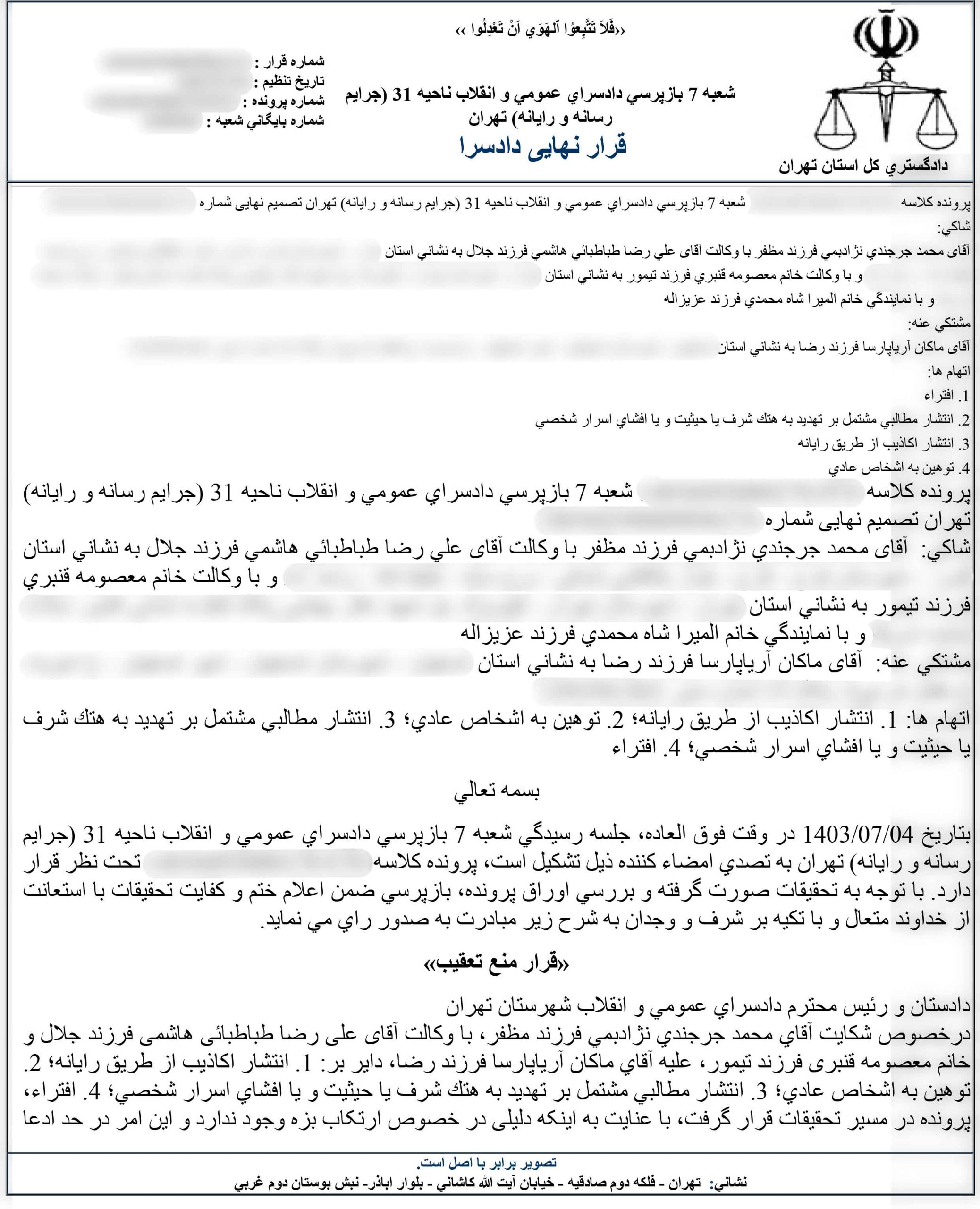 در تاریخ 9 اردیبهشت ماه 1404 جلسه ای فوق العاده در دادگاه تشکیل شد و به اعتراض آقای محمد جرجندی نسبت به حکم قبلی رسیدگی گردید. در این جلسه ادعاهای آقای جرجندی و وکیل وی مورد بررسی قرار گرفت و با توجه به اینکه دلیل و مدرک مستندی یافت نشد، حکم قبلی تایید و قرار منع تعقیب صادر شد. تایید حکم قبلی، بار دیگر نشان می دهد که ادعاهای محمد جرجندی تا چه اندازه بی اساس است. تصویر حکم صادر شده به شرح زیر است: