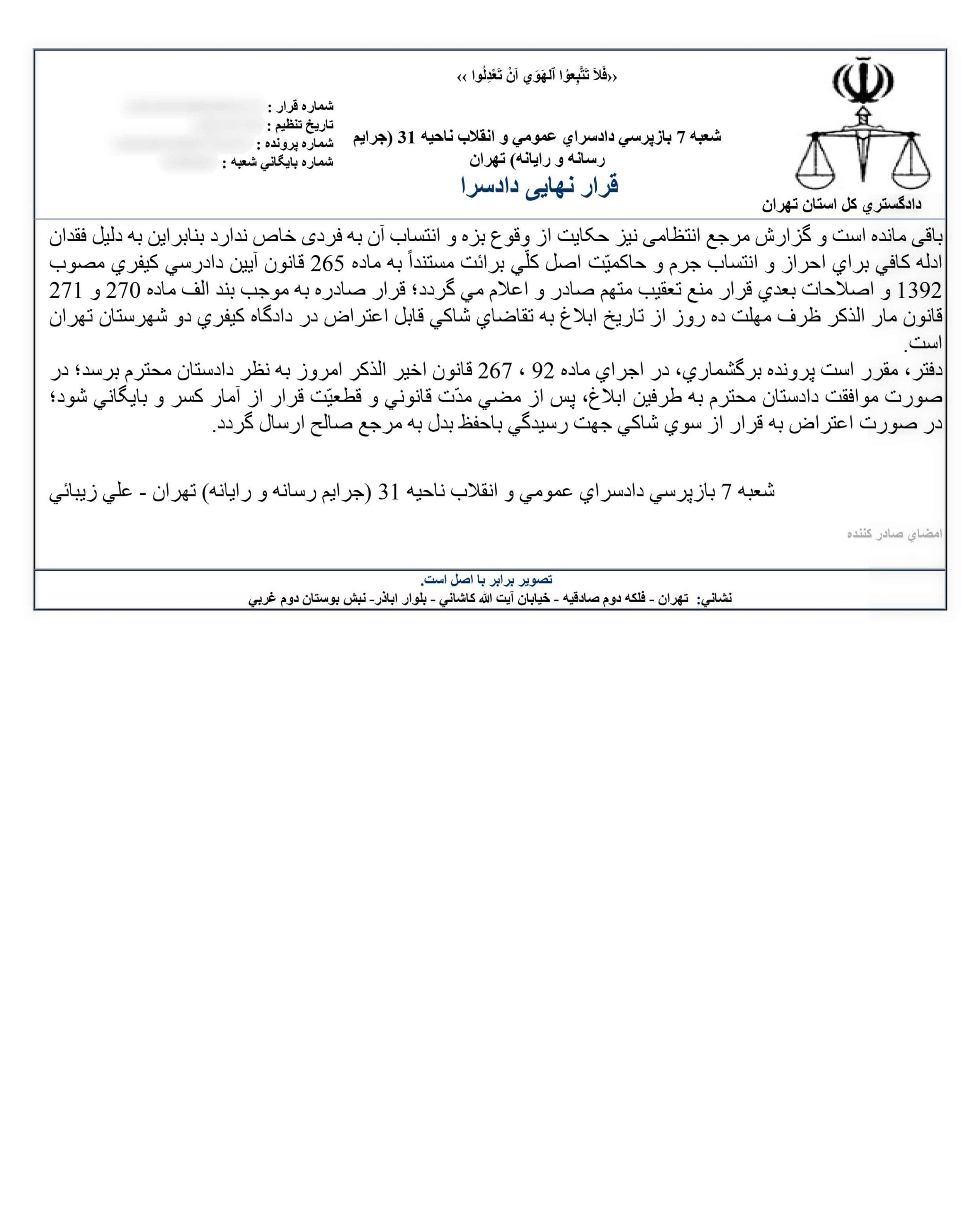 صدور قرار نهایی دادسرا بابت شکایت محمد جرجندی