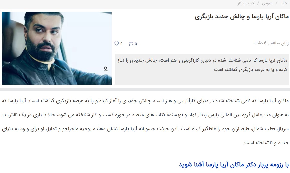 با توجه به موارد گفته شده، محرز و مسلم است که آقای محمد جرجندی و وب‌سایت ایشان اقدام به انتشار ادعاهای کذب کرده و  با درج مطالب نخ‌نما، سخیف و زرد درصدد کسب درآمدهای نامشروع است. دکتر آریاپارسا مبرا از تمام اتهامات واهی است. او جوان‌ترین کارآفرین و یکی از موفق‌ترین جوانان کشور است. “قطاری که حرکت نمی‌کند، سنگ هم نمی‌خورد” با حمایت از افراد توانا و موفق کشور اجازه جولان به بدخواهان و لومپن‌های فضای مجازی را ندهیم. ماکان آریا پارسا ماکان آریا پارسا ماکان آریا پارسا ماکان آریا پارسا و فرزاد فرزین ماکان آریا پارسا در فردای اقتصاد ماکان آریا پارسا و فرزاد فرزین ماکان آریا پارسا ماکان آریا پارسا ماکان آریا پارسا ماکان آریا پارسا ماکان آریا پارسا ماکان آریا پارسا ماکان آریا پارسا ماکان آریا پارسا ماکان آریا پارسا ماکان آریا پارسا